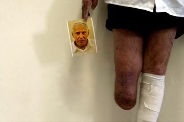 Left: A man is photographed with a photograph of himself in Jerusalem after his physical rehabilitation for the limb he lost during a suicide bombing."