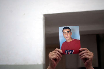 Right: "A mother holds a photograph of her son who was taken away by the IDF. "