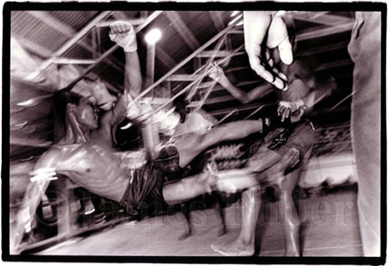 Another punch and Tun Oo is down. He hauls his small frame from the canvas, grasping the ropes for balance. A separate referee represents each opponent, one Burmese and one Thai. The Burmese ref gives Tun Oo a standing count. Musicians hammer feverishly on cymbals and drum, accompanying the screeching reeds of an oboe. Tun Oo’s trainer shouts orders at him over the din. Advance blocked by the Thai ref, Super Kay tightens a stray strip of hemp that binds his fist. No gloves are worn in these bouts. The refs shake hands for the fight to continue. Super Kay leaps forward, delivering a rib kick and vicious hook, crumpling Tun Oo to the canvas for the full count. Cornermen feed the boy through the ropes to make way for fresh contenders. |
