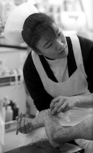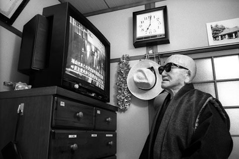 (Left) A nurse attends to Mr Nambu feet. Patients must be closely monitored. The loss of sensitivity prevents them from feeling if they have hurt themselves, or to notice if an infection or skin condition is developing. (Right) Like most blind patients living in the center, Mr Nambu owns a television set. He enjoys listening to the 7 o'clock news and weather forecast every morning.
