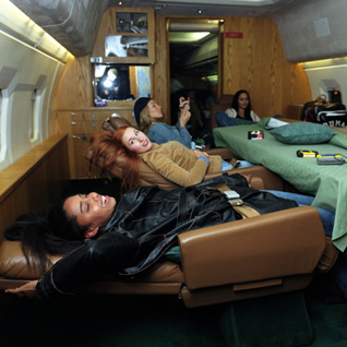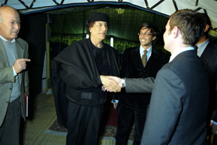 Above: Colonel Gadaffi meeting journalists and Miss Net World president Omar Harfouch, in his compound in Tripoli. Left: Contestants were flown from Kiev, Paris and London to Tripoli on private jets.