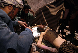 (This page:) Men mourn the death of a man who died of cold during a trek across the mountains in search of food.
