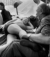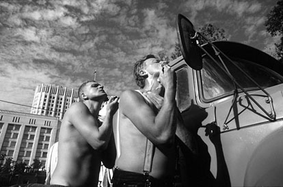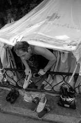 ( Above: Sergei Menyailo, l, and Mikhail Zankovich , r, Coal miners from the Arctic circle double up on a truck mirror during a morning wash and shave in front of the Russian Parliament. Right top: A miner receives a massage from a colleague after a night sleeping on the cold hard stones of Gorbaty Bridge. Some had soft mattresses during their stay in Moscow but others were proud of the hardship they endued. Right below: A miner from Rostov-on-Don emerges from his makeshift tent which he shares with several others. The length of stay of miners varied from a week to several months in the tents city that sprang up to accommadate the visitors.) |