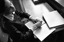 (Left: A girl enjoys the warmth of the sun on her face. Below: Learning to write braille by using a template and punching holes in paper.)