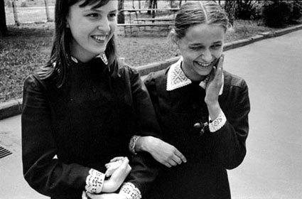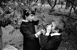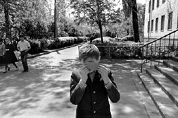 Clockwise from left: Walking in the school yard. Smelling the sweet scent of Lilac flowers in the courtyard. This boy, with acute near-sightedness, can see forms when he holds a small book very near to his eyes. |