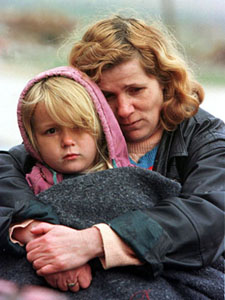 Ethnic Albanians in Kosovo are being executed and expelled from their villages by the Serbian army, reports of attrocities are filtering out with the thousands of refugees crossing into Macedonia, Montenegro and Albania. This woman and child who were photographed 17 Mar '99 in Glogovac, some 35kms. northwest of Pristina, were fleeing Serb forces attacking in the Drenica region even as the Paris talks attempted to avert a Nato attack. |