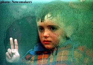 An ethnic Albanian boy shows a two-fingered victory sign as he travels on a bus having been expelled from Kosovo. Photographed in Blace on the Kosovo- Macedonian border , some 20 kms West of Skopje, 03 April '99. NATO airstrikes against Yugoslavia continue as tens of thousands of Kosovars flee the country. |