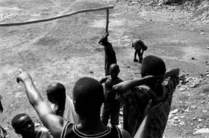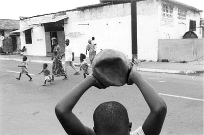 Sport helps to break the mundane cycle of survival. In the notorious Westpoint district of Monrovia, kids while away the hours playing basketball. Their dilapidated court demonstrates a resourcefulness crafted through years of conflict. By Popo Beach, local girls gather to play a sport called kick-ball. In neighboring Clara Town an army band still draws the kids with its attractive fanfare, but when football hero George Weah revisits the town of his roots, hundreds turn out to greet him at the community pitch. |