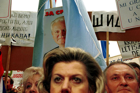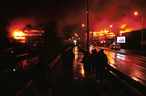 | (Clockwise from top left: Cruise missiles explode on the horizon just outside the capital, Belgrade - 28.03 99; a rally in central Belgrade organized by the Workers Unions of Yugoslavia - 22.04.99; pedestrians watch the bombed Interior Ministry building burning - 04.03.99 ) | ||||||||||