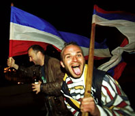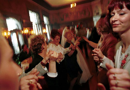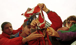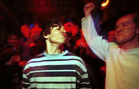 | (Clockwise from top left: Women dance at a wedding party, Belgrade - 18.04.99; Serbs spend the night on a Belgrade bridge acting as a human shield - 11.04.99; the dance club "Industry" is filled to capacity with ravers during the afternoon hours, Belgrade- 14.04.99; burning the American flag at the daily rock concert in the center of Belgrade - 30.03.99) | ||||||||||