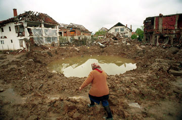 | (Clockwise from top left: Damage in the southern Serbian city of Aleksinac that was hit by two missiles fired by NATO planes - 04.06.99; local residents mourn in the town of Surdulica in southern Serbia where 20 civilians were killed by NATO bombs (Nato admitted that its bombs missed the military target) - 28.04.99; a resident of Aleksinac clears her home - 04.06.99; a huge bomb crater in the town of Nic - 24.06.99) | |||||||||
