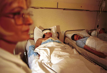 | (Clockwise from top left: Injured men lie in a hospital ward after the bombing of the Zastava factory in the city of Kragujevac - 10.04.99; thousands gather to pray and to hear Russian Orthodox Patriarch Aleksej speak in Belgrade - 20 04 99; women from Pujanovci village dance on the wing of a shot-down US plane.) | ||||||||