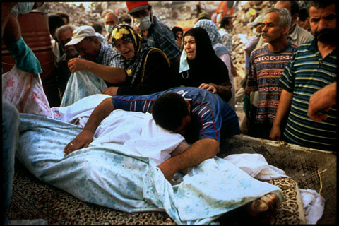 London Independent, "that four major towns- Yalova. Golucuk, Izmit and Adapazari- may have been razed. Not a single house in a chain of communities stretching from Istanbul to Adapazari is safe to occupy." At a 500-tent city near Izmit, a charitable organization is managing to serve three meals a day to 1,200 people, including many recently orphaned children. Newly dug graves on a hill above the ruined city of Adapazari are sprinkled with quicklime against the spread of disease and the city's railway station and soccer stadium are being used for hospital space. Amongst the sorrow and despair there is also anger. Public anger is rising against the government for their failure to prepare against earthquakes and to regulate the building trade. Contractors have put up flimsy buildings to cut costs and building inspectors have let them get away with it. |