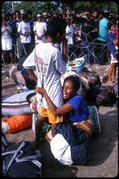 Dili: Every day people gather near the harbour, hoping to find members of their family among the returning refugees. This woman got off a boat from West Timor to learn of the death of her husband.