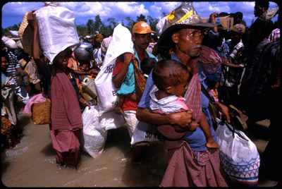 Refugees come home across the Malibaca river after months living in camps run by the pro-Indonesian militia. on this day 2000 people were allowed to cross leaving tens of thousands remaining in the camps.