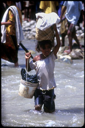 Maliana: A young refugee crosses the Malibaca river heading to a free East Timor.