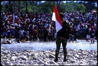 An Indonesian soldier stands guard at the Maliana crossing. On the far bank of the Malibaca river, in East Timor, people are waiting to see if some of their relatives are among the returning refugees. |