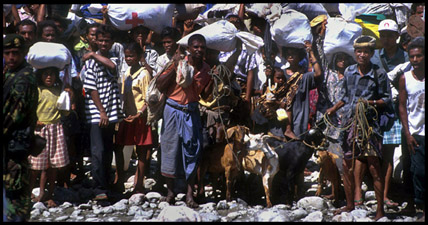 East Timorese refugees waiting to cross the border on the Indonesian side of the Malibaca river. The border crossing is open from 9 until 10 am and only a few are allowed to return home each day.