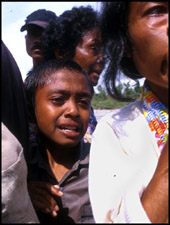 Maliana: A boy weeps as he returns home to East Timor. His family is still on the Indonesian side of the border.