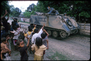 An Australian A.P.C. driving through Atabai village. .
