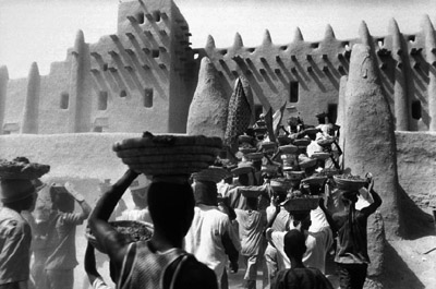 The famous mosque of Djenné rises on its bank of clay and sand above the market square in the town centre. The loam plinth allows this most sacred of buildings for the Djenné community to be displayed to its best advantage. The house of the gardien controls access to the mosque.
