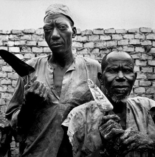 A great many of the inhabitants of Djenné are involved in the fête de crépissage. From young to old, experienced to novice, everyone has a task suited to their capacities and abilities. Young men and boys, the helpers, carry the baskets with loam. A few expert bricklayers who apply the loam to the pointed spires adorning the roof of the mosque wait atop the ladders.