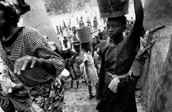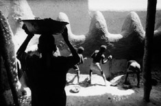 Havent you seen us yet? Come and take a look! yells a mud-smeared helper to a woman looking on sympathetically from the courtyard of the house of one of the master bricklayers. It is the second and final morning of the fête de crépissage, and the sun is already high. The Barey-ton has selected the woman, along with four others, to prepare this years closing feast. She pounds the millet with a long wooden stick. This is the basic ingredient of the chunky doughnuts cooked for the feast. It all starts at around noon, so she has to get a move on.
